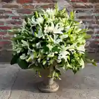 Un diseño sobrio y sofisticado que resalta la pureza y la elegancia. Este arreglo combina flores de temporada en tonos blancos y verdes, logrando un estilo fresco y armónico. Su delicadeza lo convierte en la opción ideal para matrimonios, ceremonias religiosas o eventos donde se quiera transmitir paz, serenidad y distinción.