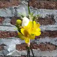 Un boutonniere elegante y fresco que combina flores blancas y amarillas de temporada en un diseño compacto y armonioso. Ideal para novios y padrinos que buscan un toque de luz, alegría y sofisticación en su atuendo nupcial. Este detalle aporta estilo y frescura, convirtiéndose en un complemento memorable para la boda.
