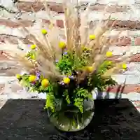 Un arreglo original y sofisticado que combina la textura elegante de las colas de zorro con el toque vibrante de las craspedias. Su diseño moderno transmite frescura, estilo y distinción, ideal para matrimonios, recepciones o para dar un aire creativo y lleno de vida a cualquier espacio.