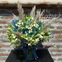 Un arreglo encantador y sofisticado que combina la textura singular de las colas de zorro, la elegancia de los lilium y la frescura de las ilusiones azules. Presentado en un florero mediano, este diseño transmite armonía, romanticismo y distinción, ideal para matrimonios, recepciones o para decorar espacios con un estilo único y elegante.