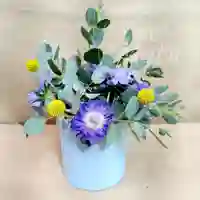 Florero pequeño con flores naturales en tonos amarillos y celestes, ideal para decorar mesas, rincones o detalles especiales en matrimonios y eventos. Su combinación de colores aporta frescura, armonía y un toque alegre, creando un ambiente encantador y delicado.