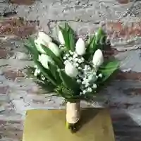 Ramo de novia con 10 tulipanes blancos naturales, símbolo de pureza, elegancia y amor sincero. Ideal para bodas clásicas o modernas, su diseño minimalista y fresco aporta un toque de distinción y armonía al look nupcial. Perfecto para novias que buscan belleza en la sencillez.
