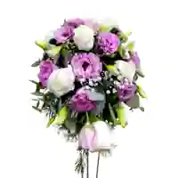 Un diseño elegante y fluido que combina la suavidad del lisianthus rosado con la pureza del blanco en una composición en cascada. Su caída natural aporta movimiento y romanticismo, ideal para novias que buscan un estilo clásico, sofisticado y lleno de frescura.