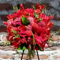 Un bouquet vibrante y elegante que combina flores rojas de temporada en un diseño armonioso y sofisticado. Este ramo transmite pasión, romanticismo y fuerza, ideal para novias que buscan un estilo llamativo y lleno de encanto en su día especial. Perfecto para aportar un toque de color intenso y elegante a la boda.